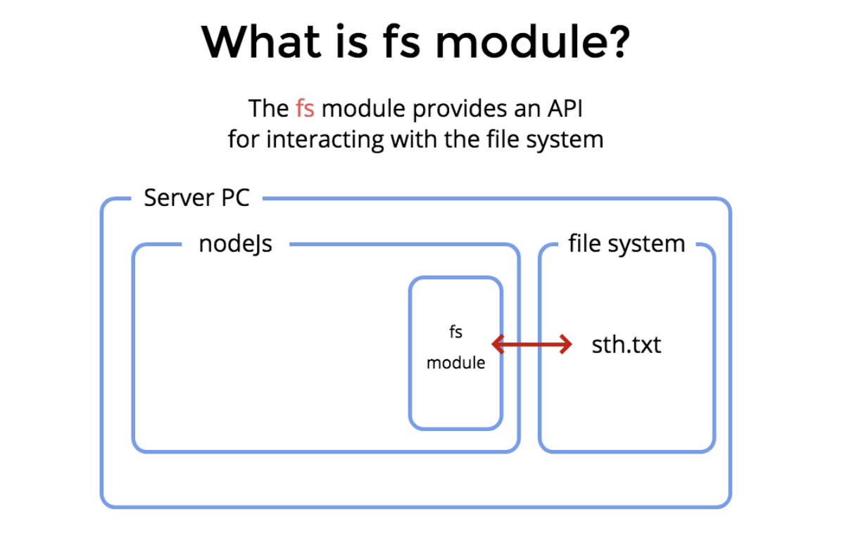 - node.js의 fs module은 OS(Windows, Linux, Unix(macOS))의 file system과 상호작용을 합니다. fs module을 사용하여 서버의 local storage에 접근하고 특정 파일의 생성, 읽기, 갱신, 삭제 (CRUD)가 가능합니다.