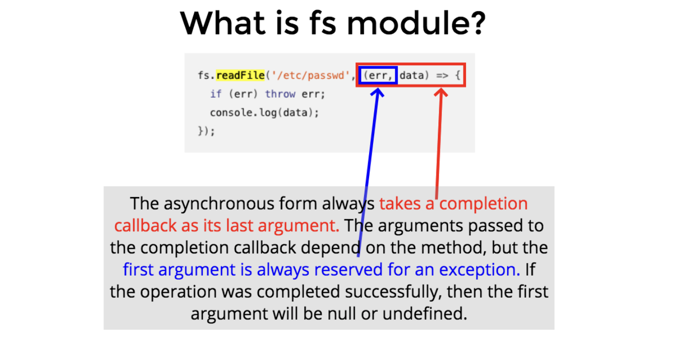 null이나undefined가 아닌 에러 객체가 들어가도록 node.js가 동작합니다. 에러가 없는 경우, 나머지 인자들을 기반으로 원하는 작업을 수행할 수 있습니다. -