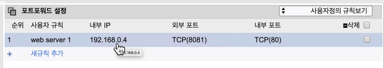 내부 IP주소가 web server 를 설치할 컴퓨터IP이고외부 IP주소가 나의 public IP에 주소를 만들 port 번호 이다.