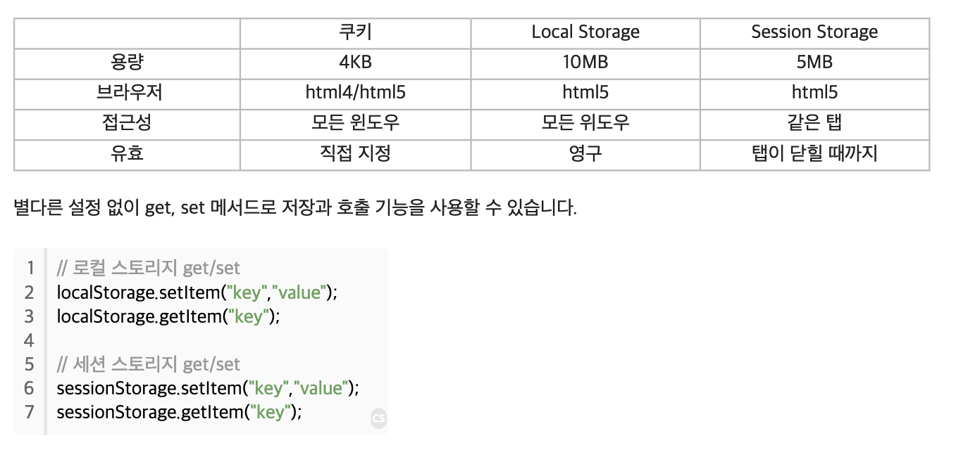 local storage는 우리가 아는 세션과 비슷하고 session storage는 쿠키와 비슷합니다. 자바스크립트로만 읽고 쓰기가 가능해 서버에서 바로 접근할 수 없고 문자열만 관리가 가능하다는 단점이 있습니다.